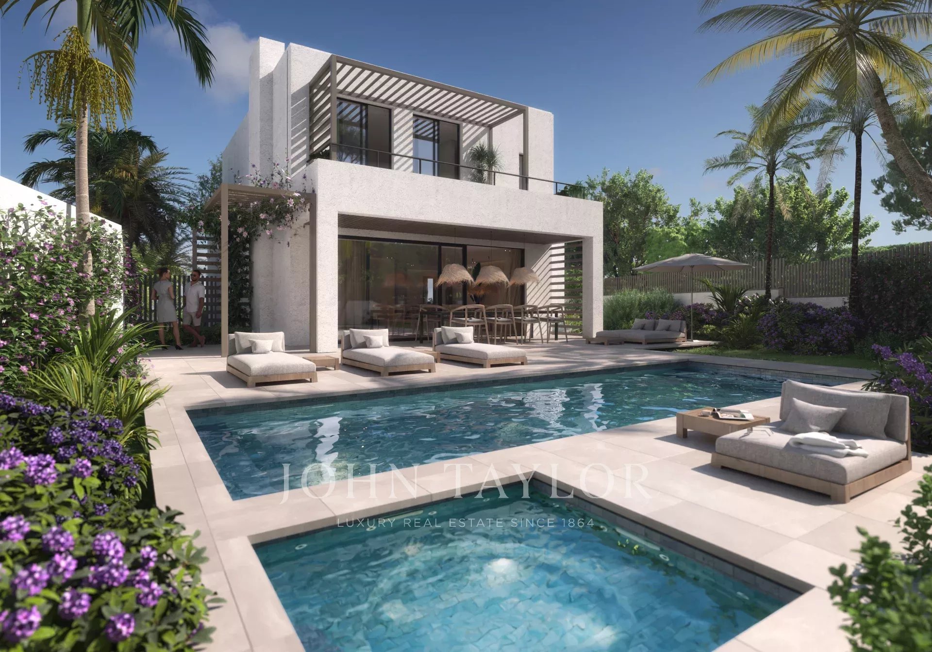 Lo spazio esterno è concepito come un’oasi privata, con terrazza, piscina, jacuzzi e giardino. È possibile aggiungere una cucina esterna, zona barbecue o area relax. La proprietà include tre posti auto.