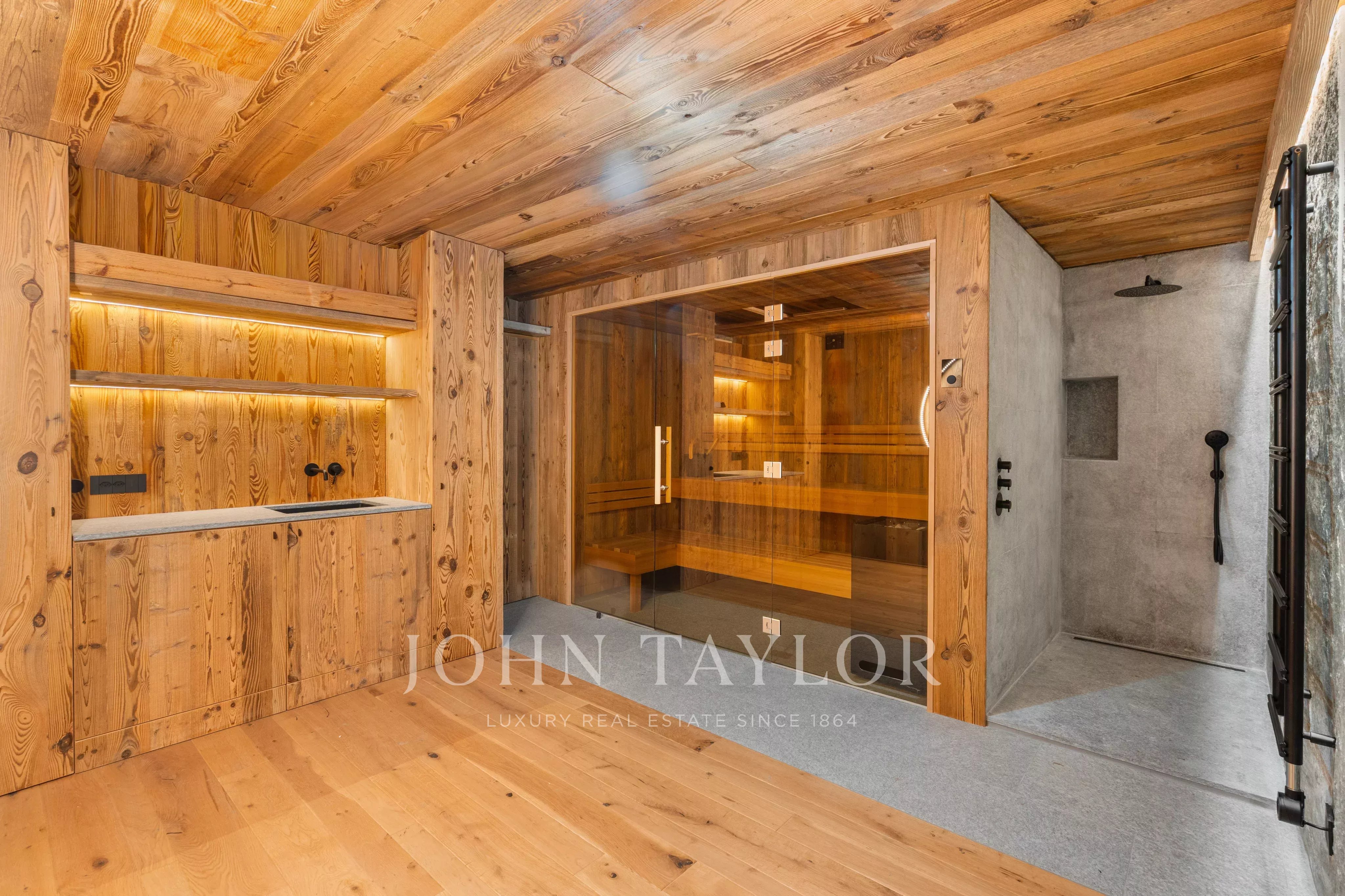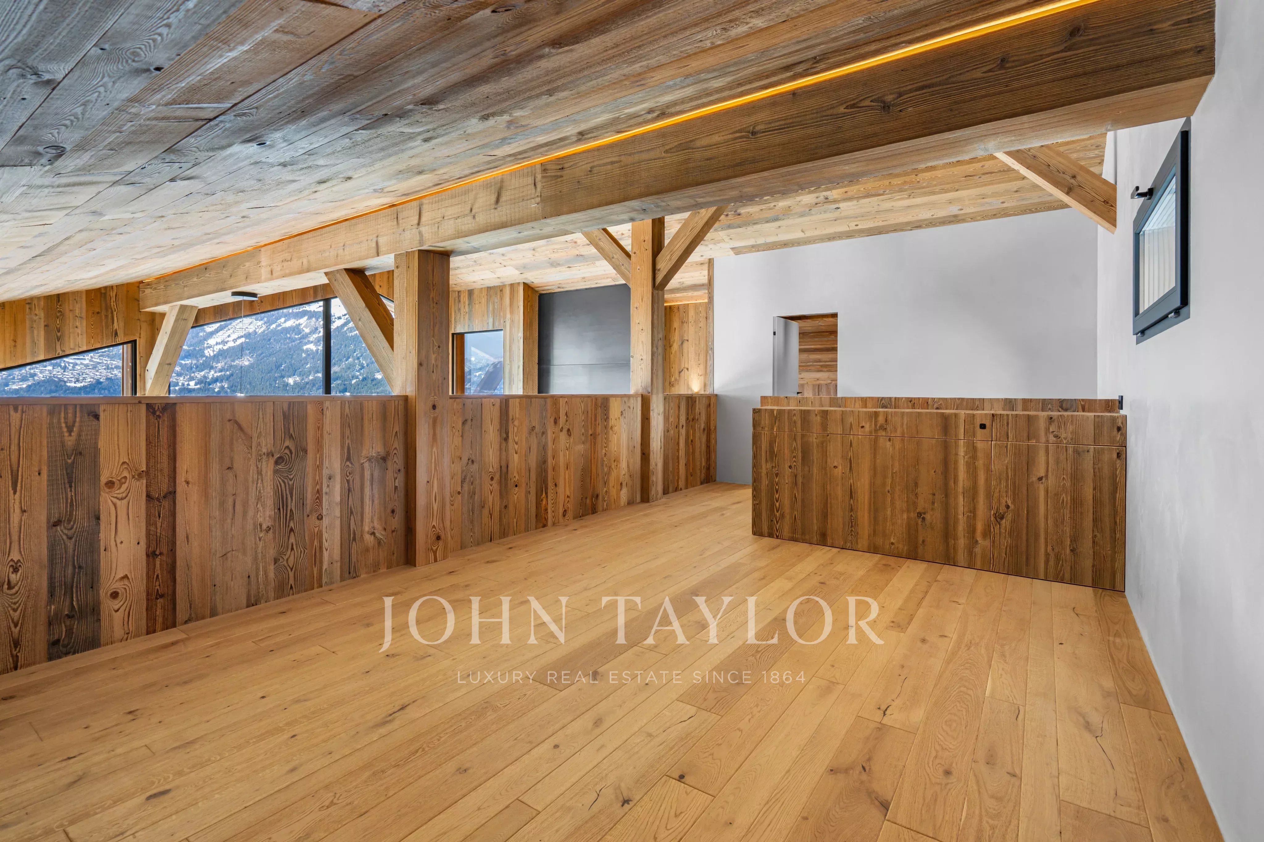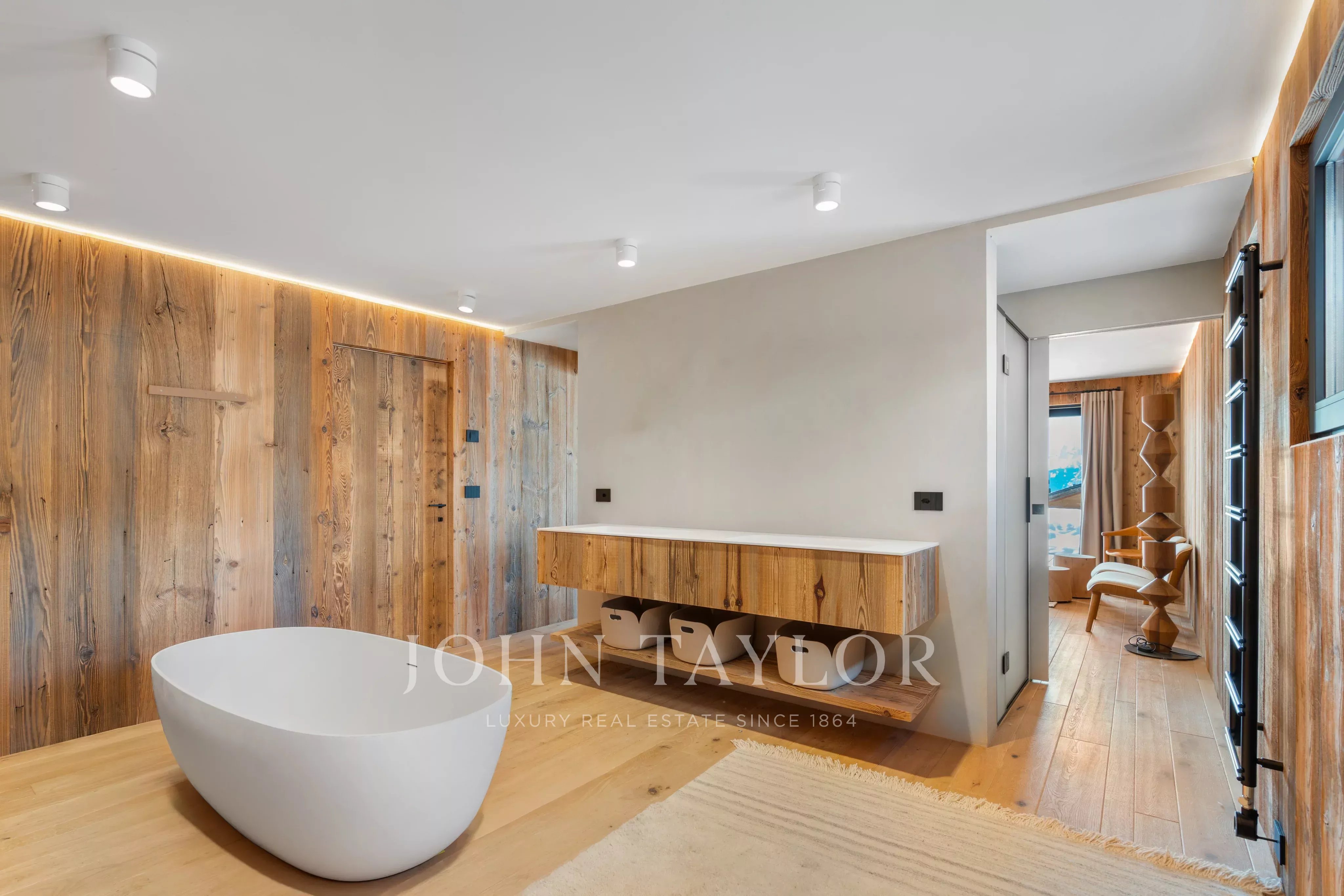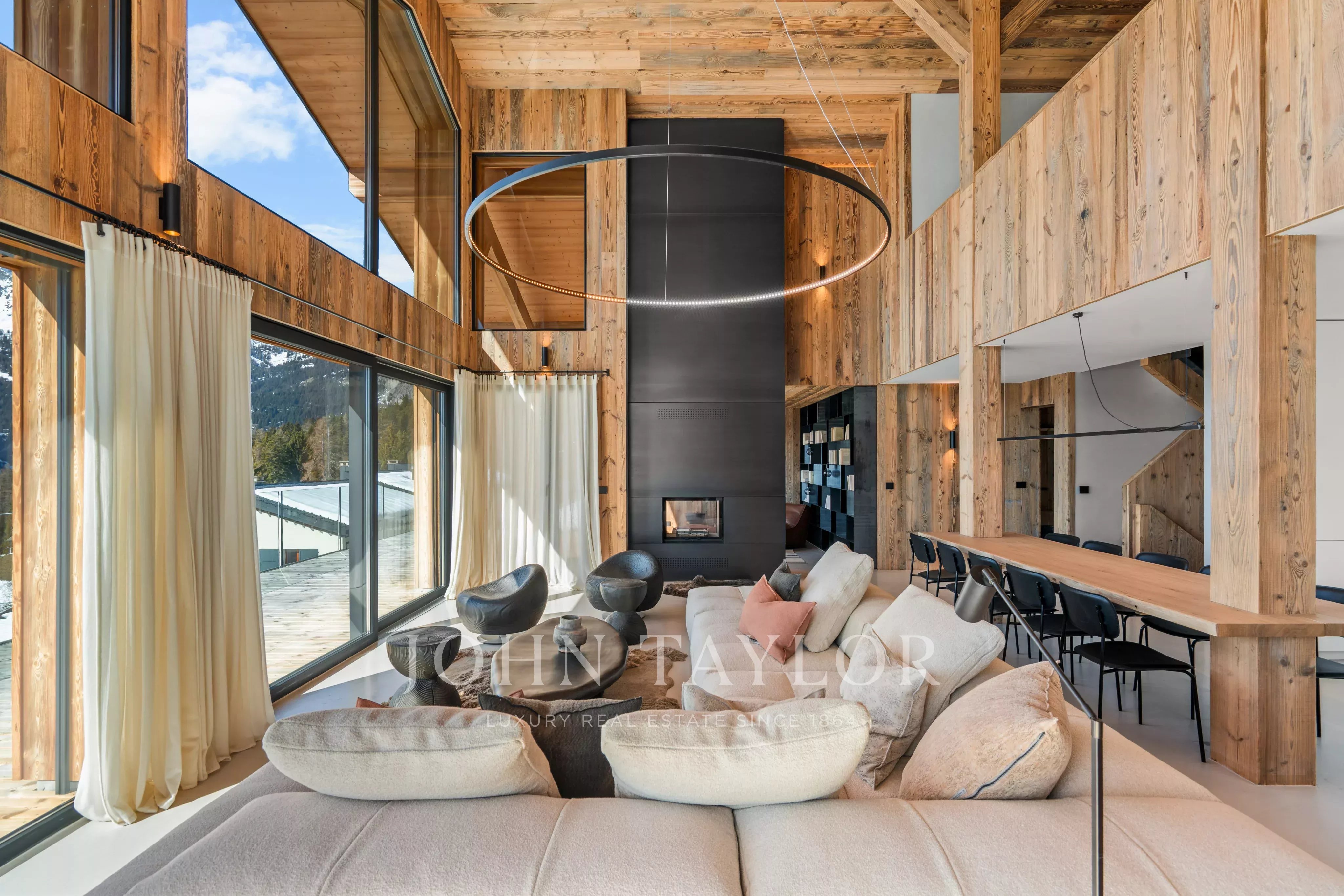 Distribuito su tre piani, lo chalet vanta una notevole quantità di luce grazie alle grandi finestre a golfo e ai soffitti alti, che conferiscono agli spazi abitativi una sensazione di apertura ed eleganza rara in montagna.