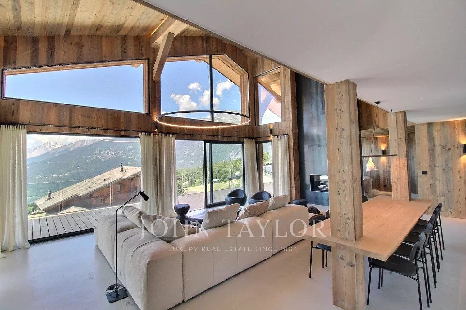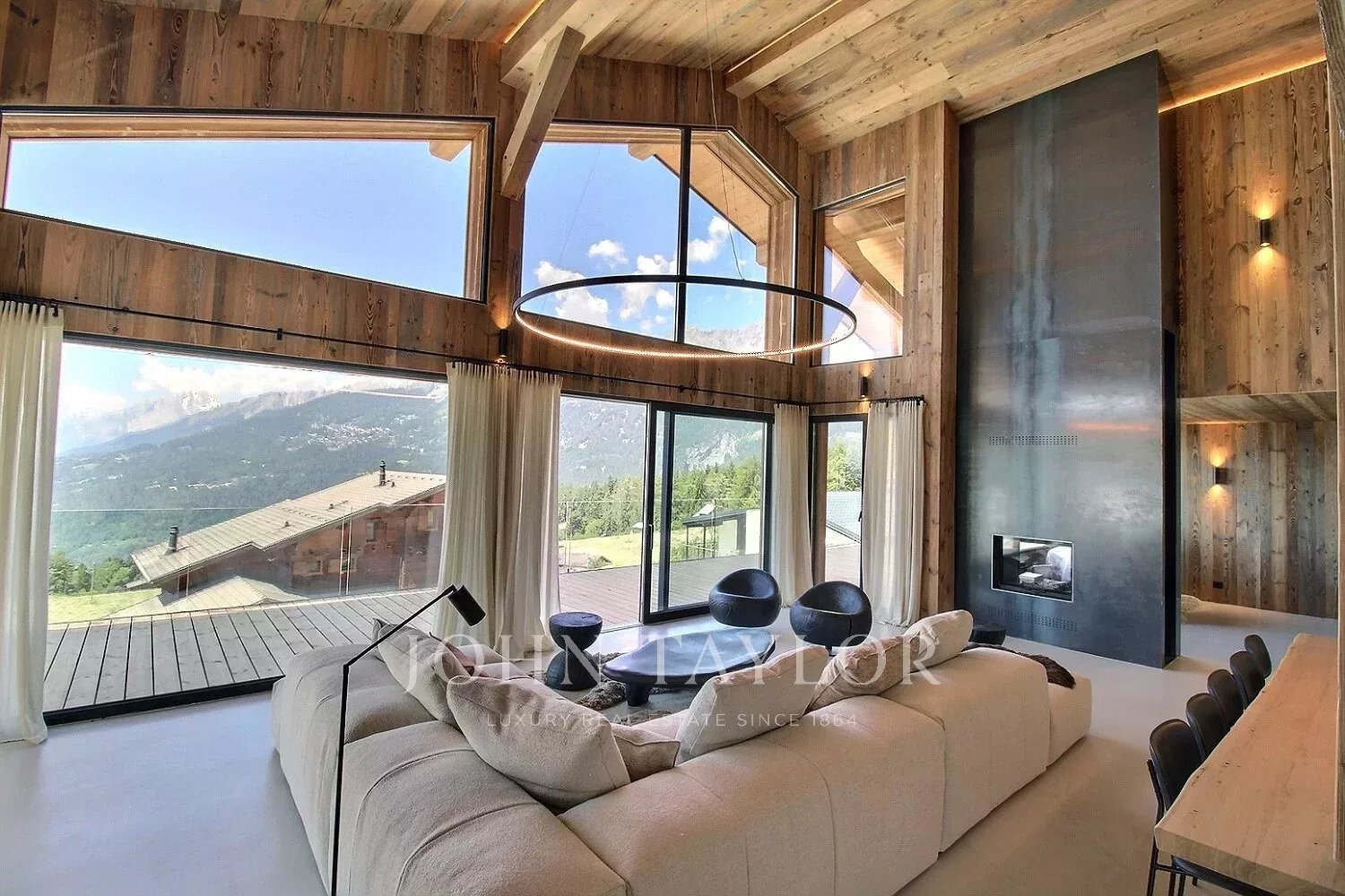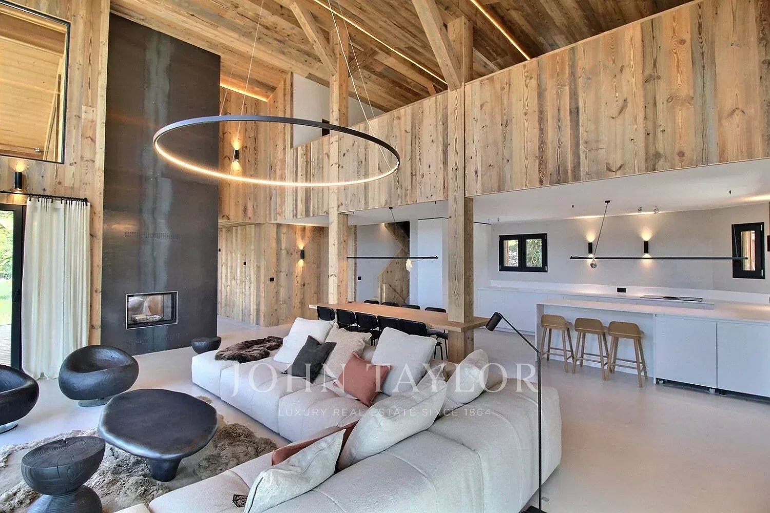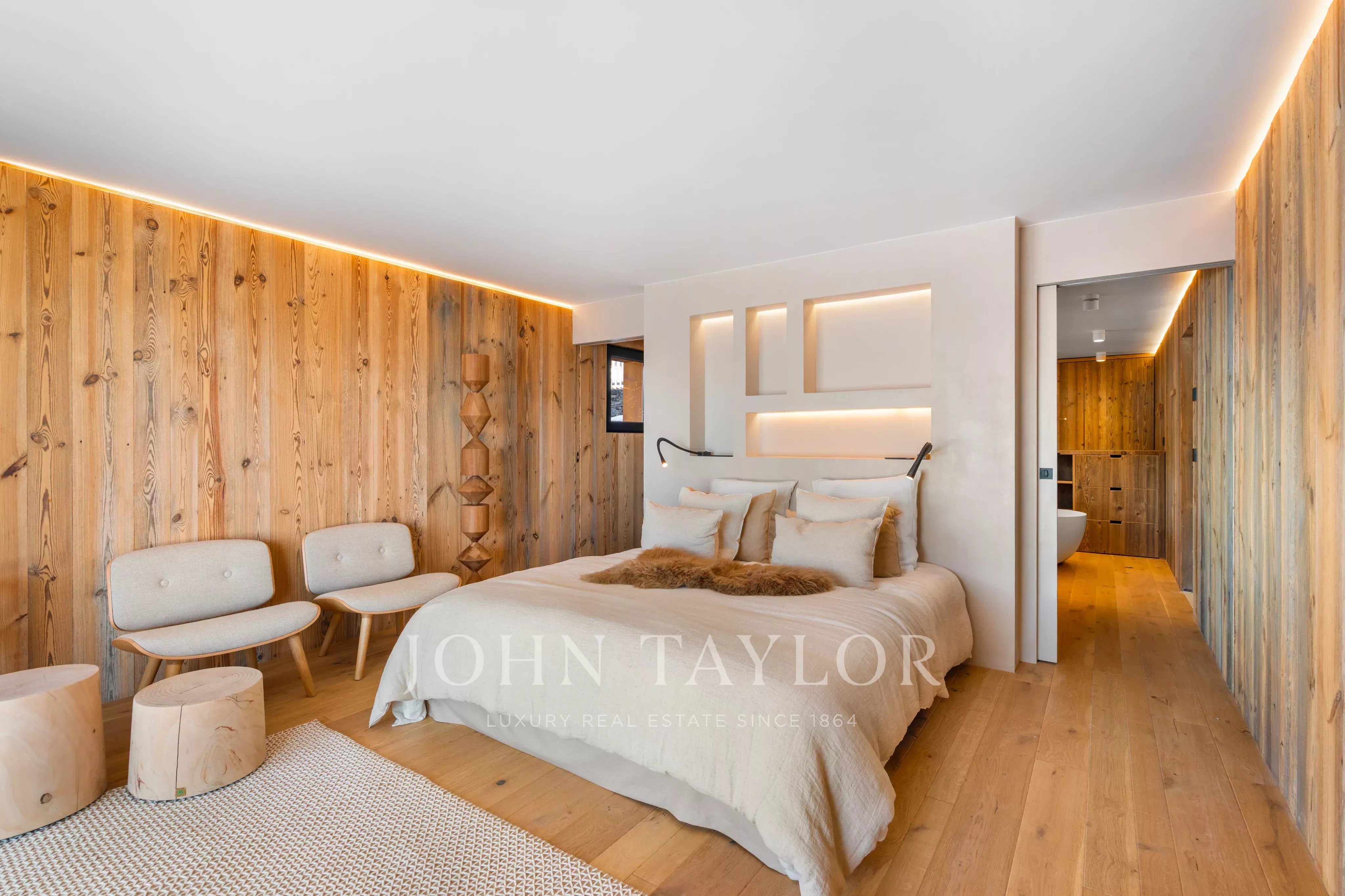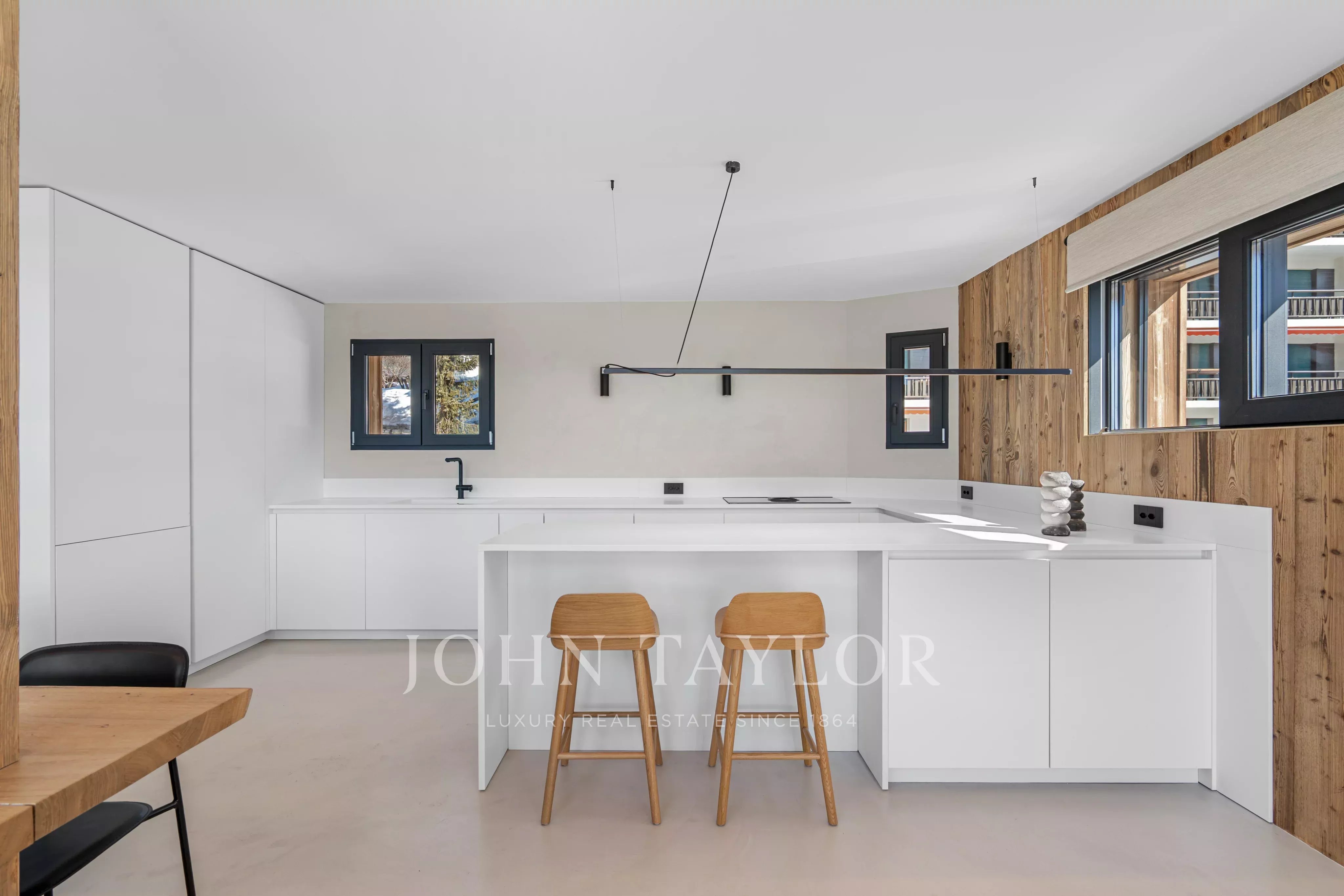 Distribuito su tre piani, lo chalet vanta una notevole quantità di luce grazie alle grandi finestre a golfo e ai soffitti alti, che conferiscono agli spazi abitativi una sensazione di apertura ed eleganza rara in montagna.