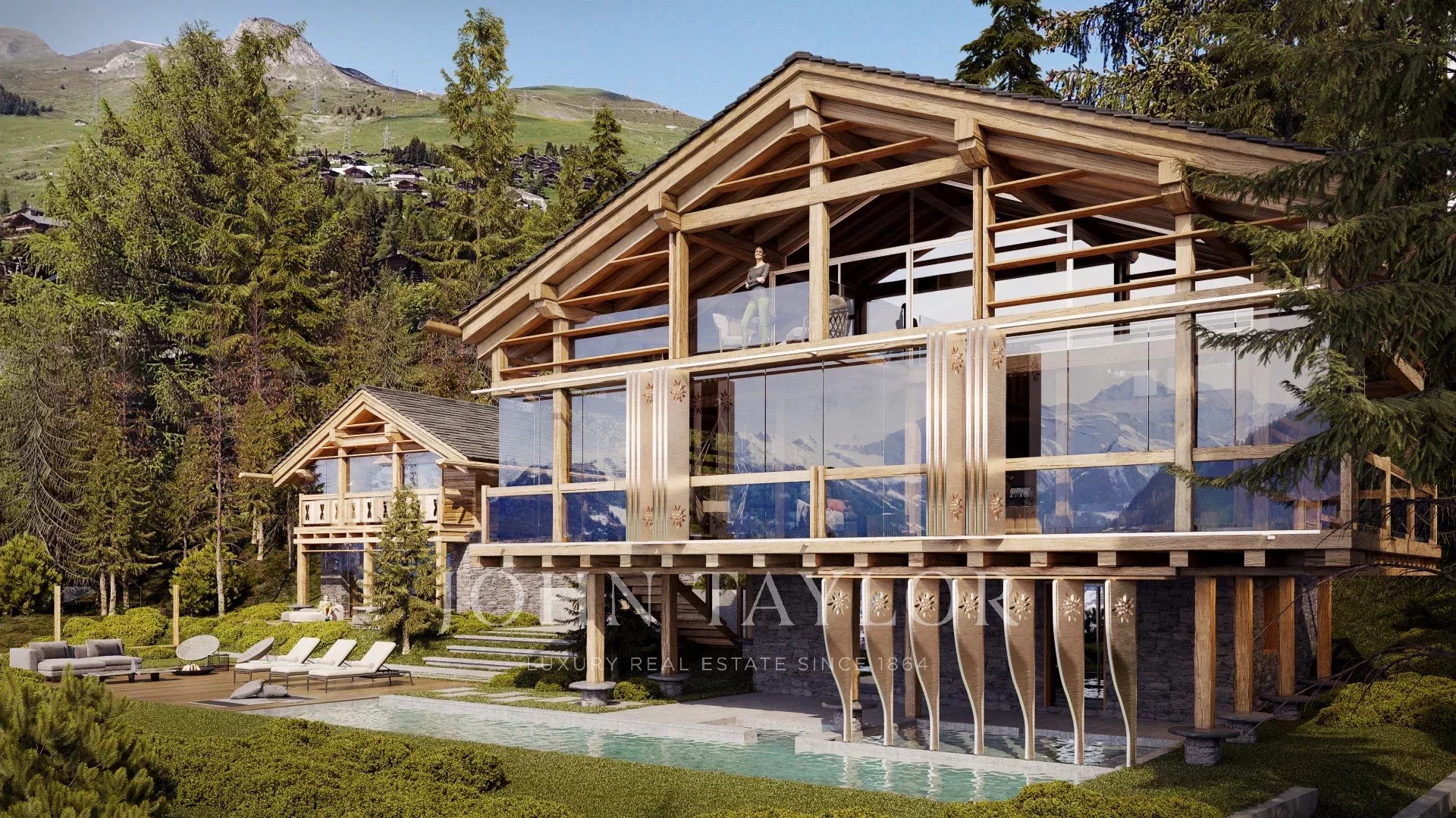 Arretrato rispetto alla strada, con una vista ininterrotta, Les Mayens du Moulin consiste nella completa ristrutturazione di due chalet esistenti, collegati da un'enorme terrazza esposta a sud.