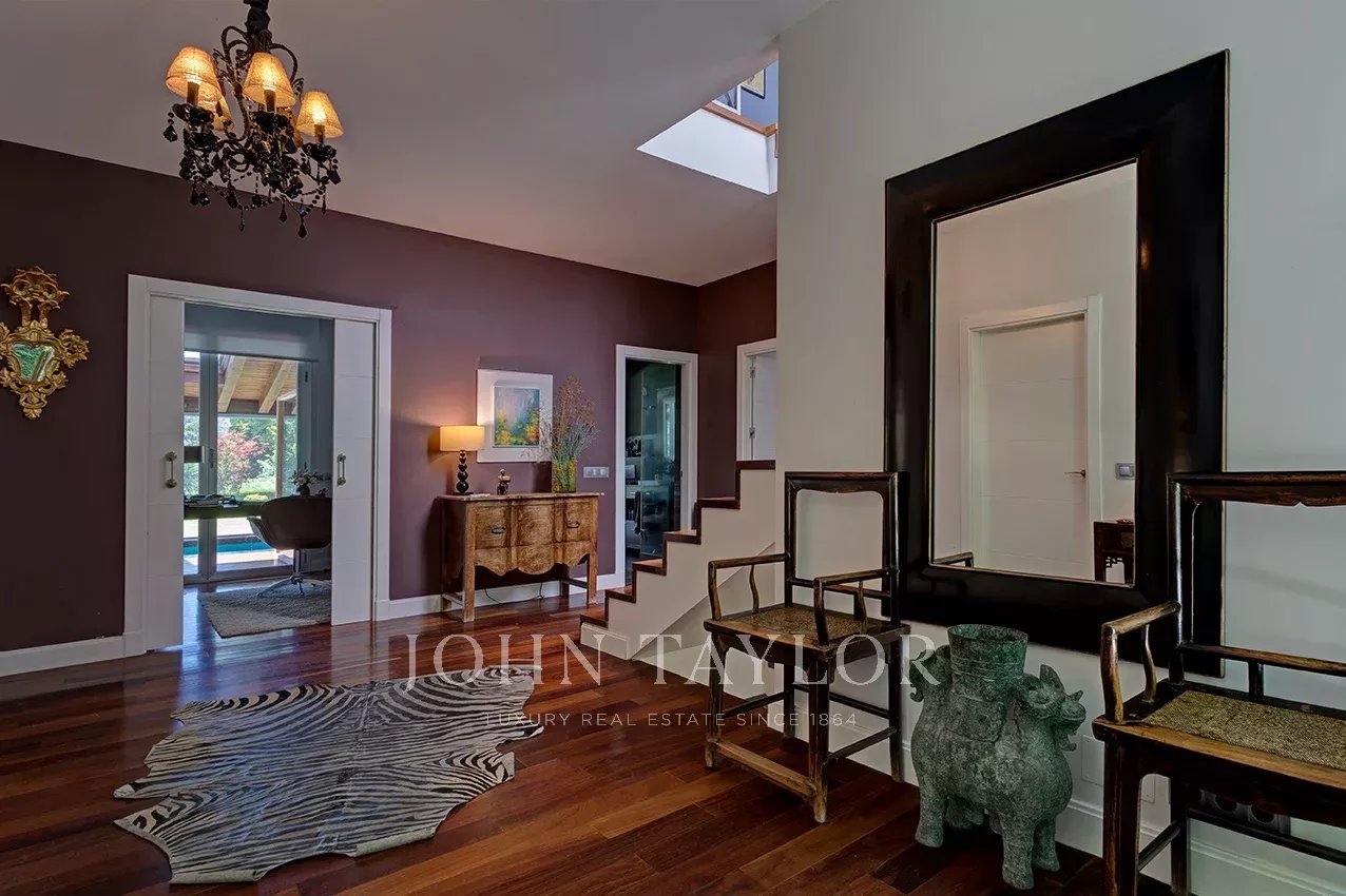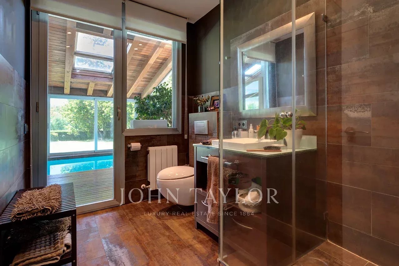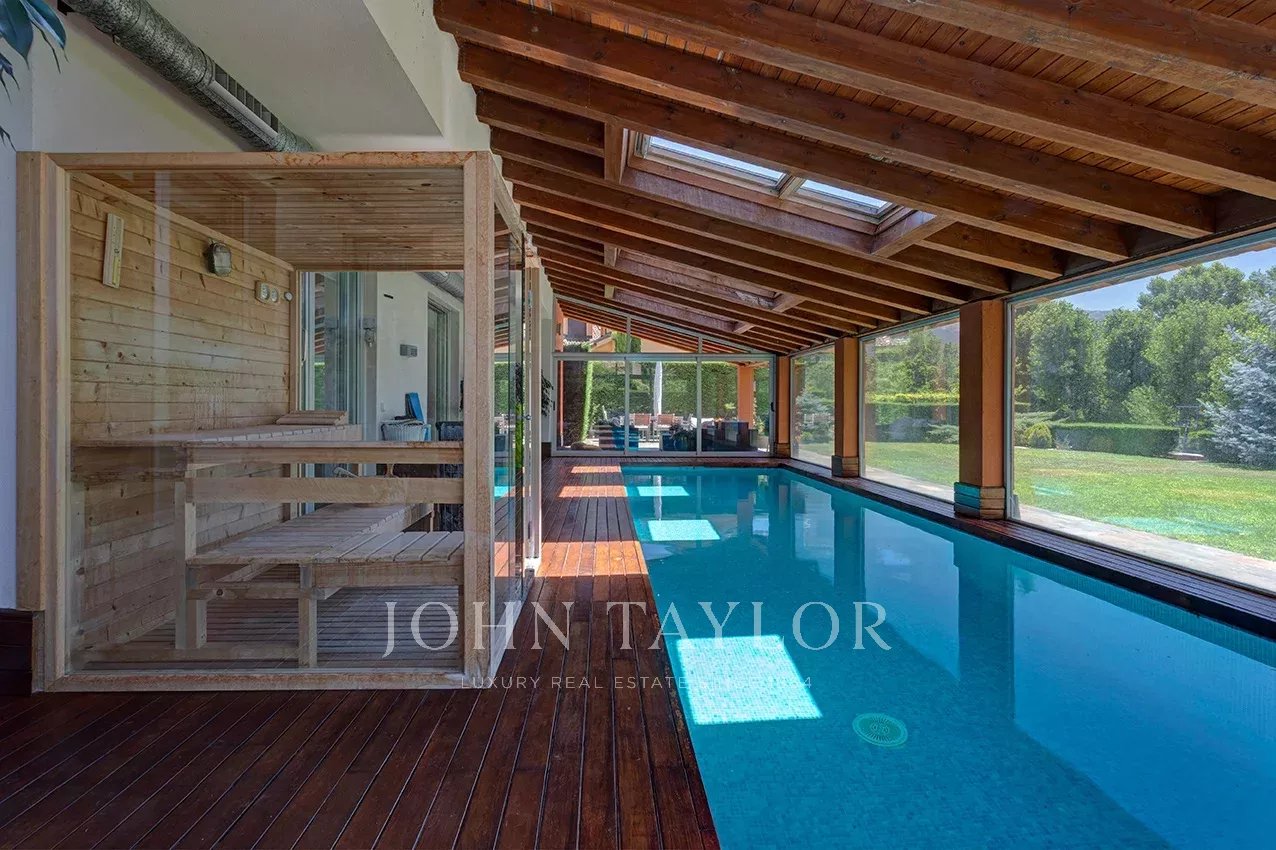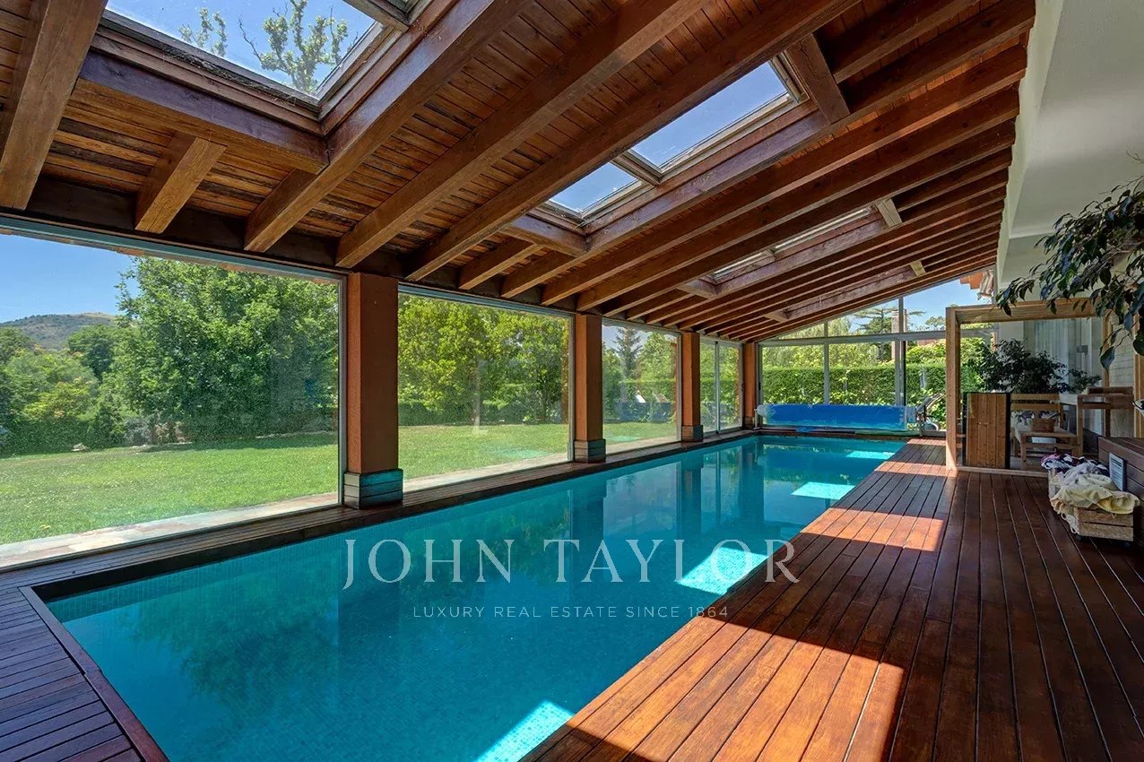 Distribuito in tre comodi piani, il piano principale è composto da un ampio e luminoso soggiorno con camino e grandi finestre con accesso al giardino e alla magnifica piscina coperta e vetrata, riscaldata, con sistema di deumidificazione, che, in estate, può essere semi-esterna per poter aprire tutta la copertura vetrata.