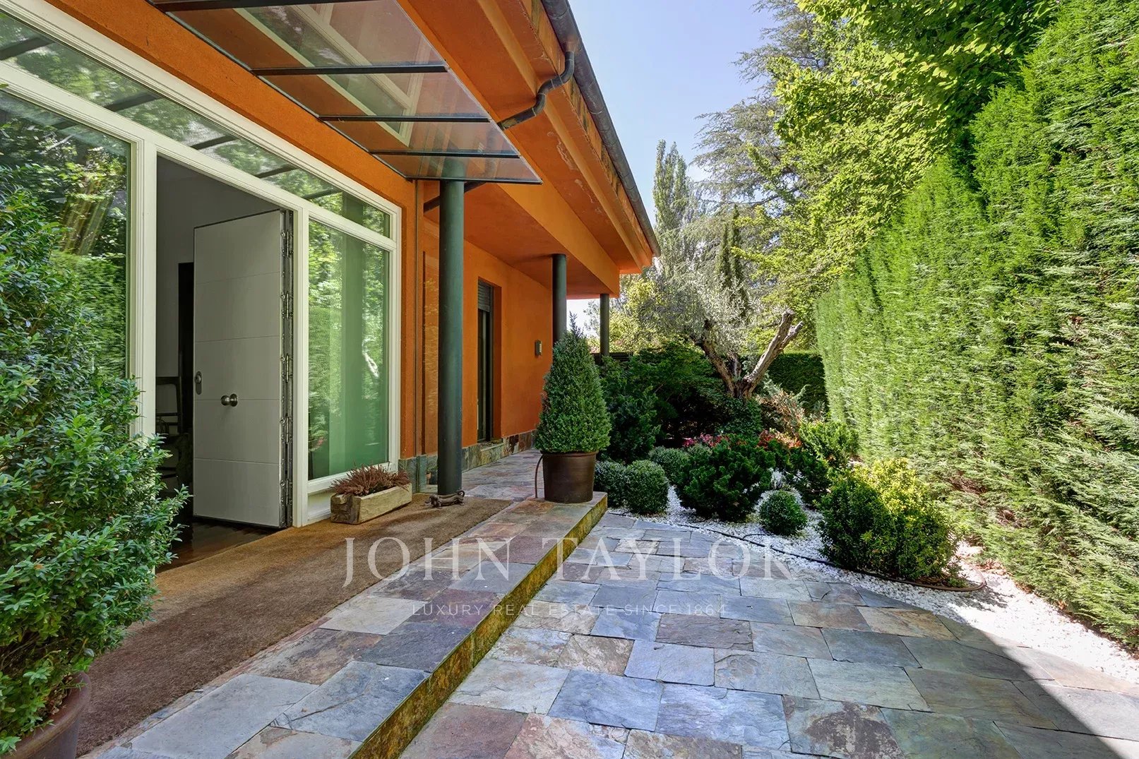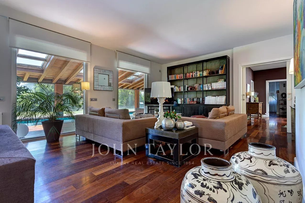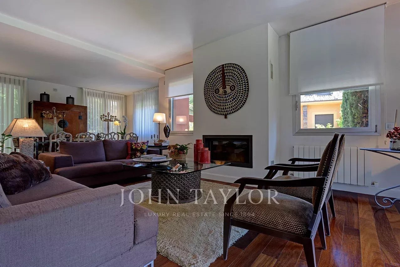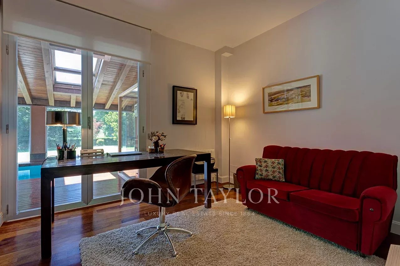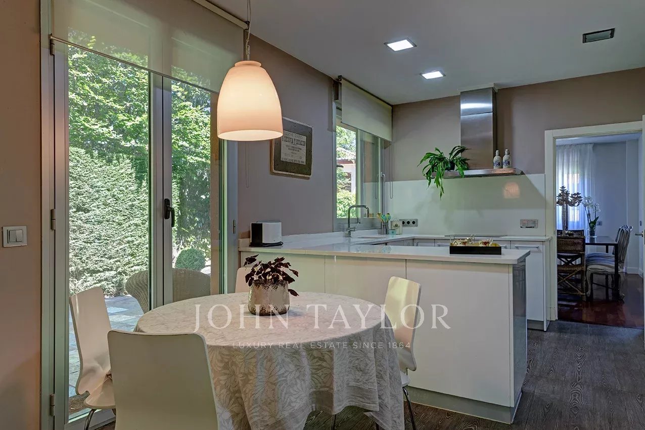 Distribuito in tre comodi piani, il piano principale è composto da un ampio e luminoso soggiorno con camino e grandi finestre con accesso al giardino e alla magnifica piscina coperta e vetrata, riscaldata, con sistema di deumidificazione, che, in estate, può essere semi-esterna per poter aprire tutta la copertura vetrata.